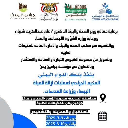 Grameen Yemen Foundation and Yemen Medicine Bank YMB are implementing a free surgical medical camp for cataract removal and lens implantation at Grameen Yemen Medical Center for Camps in Al-Maarras area, Az-Zahra District, during the period from 9 to 14 Ramadan, corresponding to 9 to 14 March.